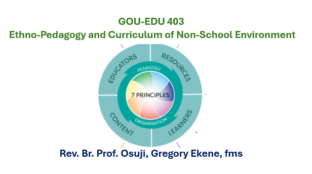 Concept of ethno-pedagogy, Meaning of curriculum, Concept of non-school environment, Critical analysis of curriculum in terms of their relevance and national goals, Relationship between curriculum and instruction in terms of objectives specification, Selection of learning experiences, learning materials, Methods and media of instruction, Scaffolding activities, Evaluation, Curriculum innovation in a subject matter area with particular reference to Enugu experience, Professionalism in home school teaching and learning, Public relations in home school teaching and learning, Establishment of study centres, Application of ethno-pedagogy at home schools.